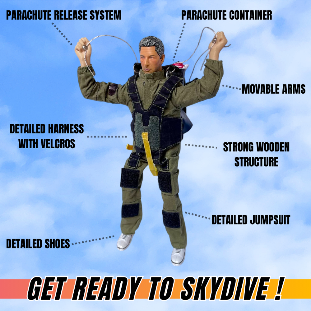 Each skydiver is entirely handcrafted. From the body to the parachute, every detail is designed with care to make it fly realistically and reliably. Each piece is unique, built with passion for aeromodelling.