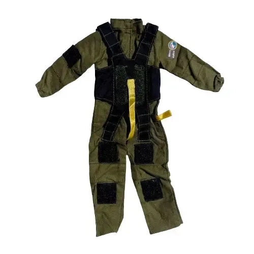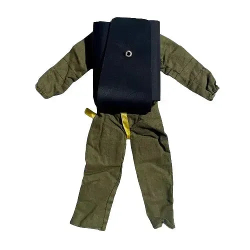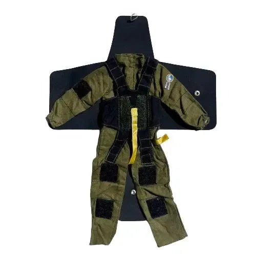 This is the jumpsuit used for the Micro Skydiver. The black container installed in the back allows you to pack the parachute inside. The container closes with a loop and eyelets, it is locked with the skydiver's release pin. The skydiver then deploys the parachute himself by releasing the closing pin with his arm.